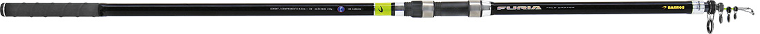 Cana telescópica, com quatro secções em carbono radial. Este modelo , com diâmetro muito reduzido, é muito versátil, permitindo a pesca nas modalidades de surf casting e buldo. A FURIA TELE CAST vem montada com um porta carretos DPS nº 22 e com passadores WM, o que facilitam o uso do cesto na captura de peixes de maior porte quando se pesca em pesqueiros altos.