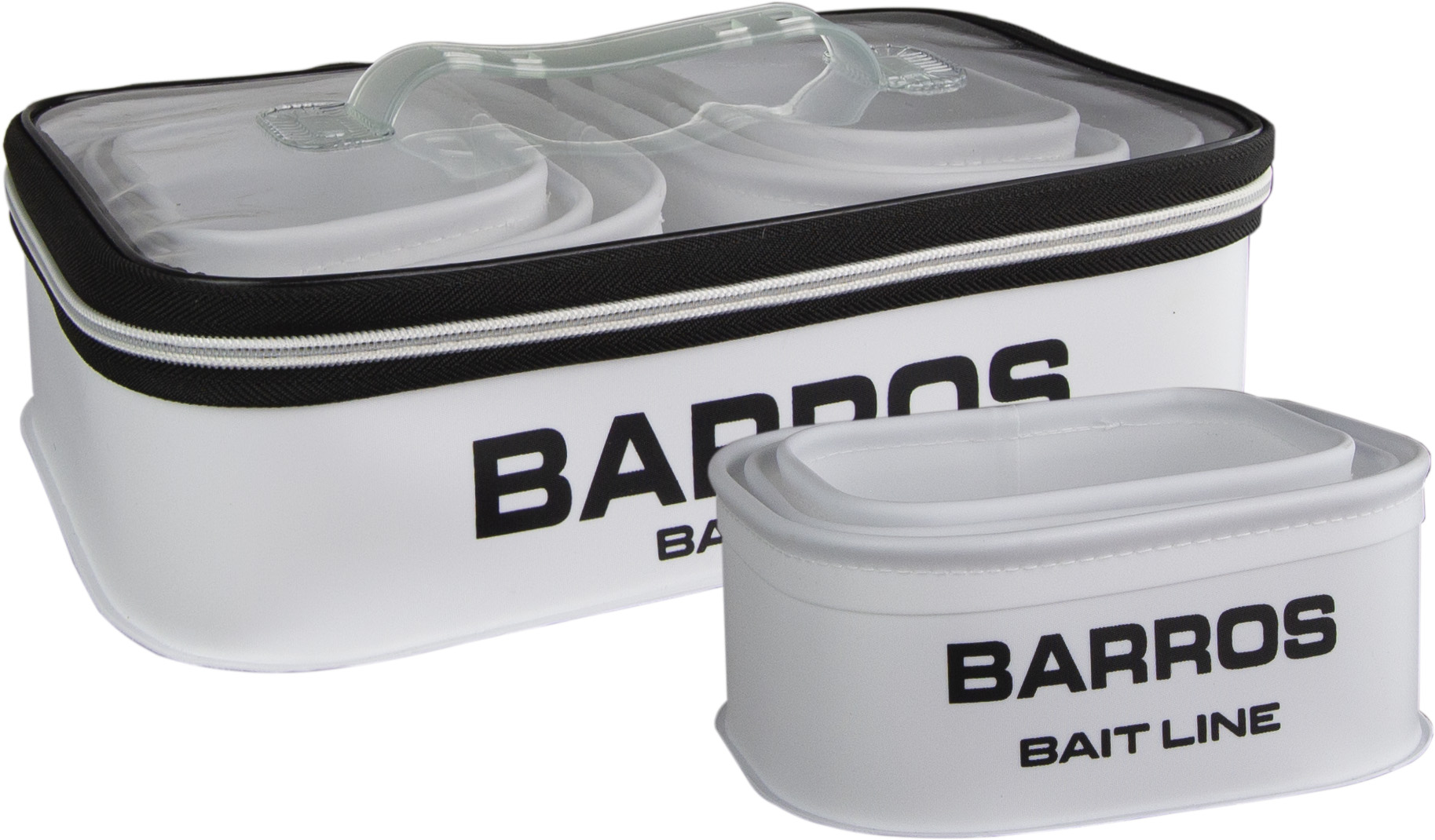 | Conjunto de sete caixas para iscos. Dentro do compartimento principal, que tem uma tampa transparente, há seis caixas em EVA de cor branca, ideais para todos os tipos de iscos, engodo e asticots colados.   - Altura: 10cm